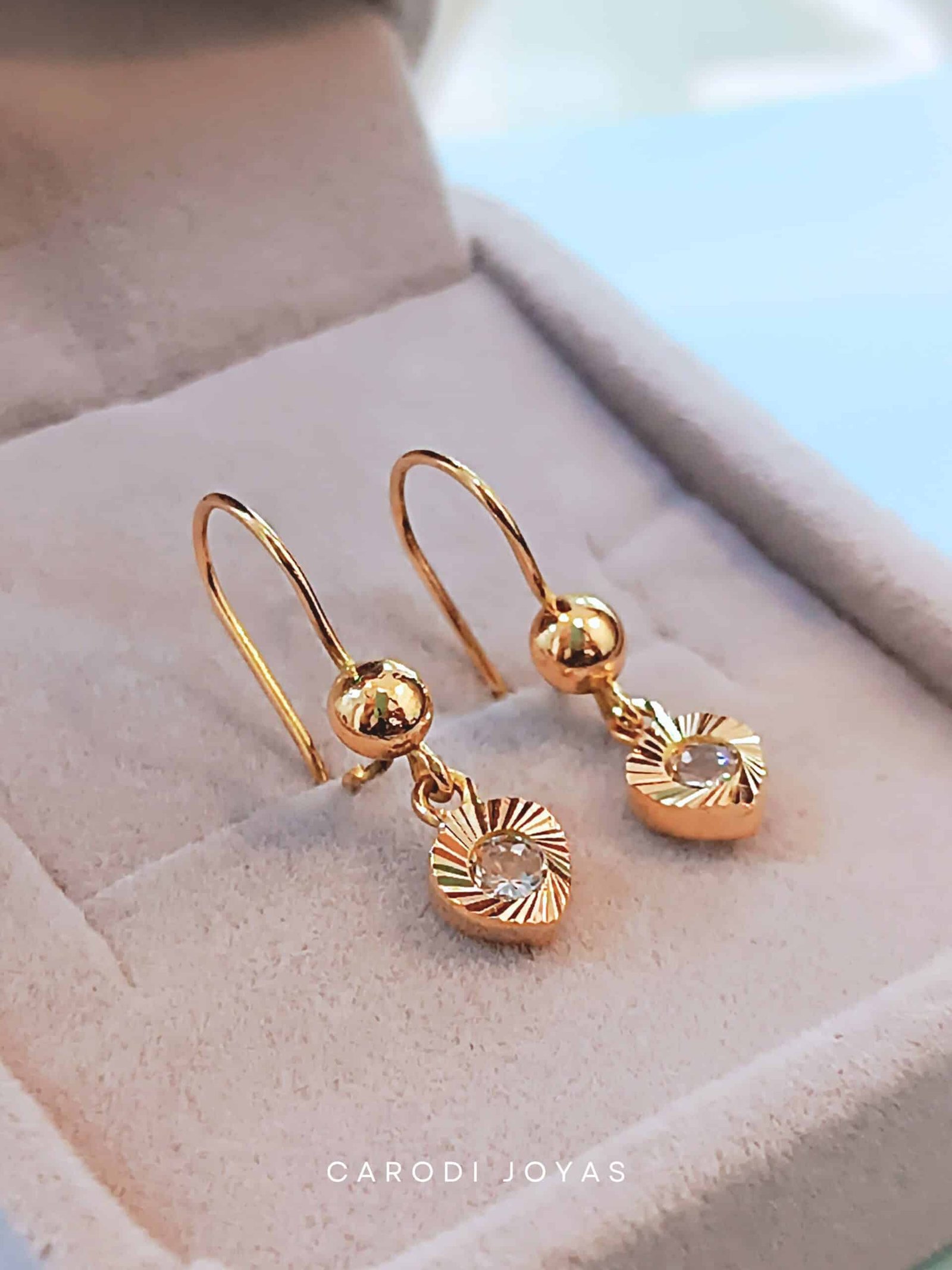 Aretes colgantes de Oro 18k Corazón piedra blanca. Déjate cautivar por la elegancia y autenticidad de los aretes colgantes. Elaborados en oro rosa de 18 quilates, estos pendientes son una joya atemporal que realzará cualquier look. Su diseño destaca por el corazón con bordes con textura diamantada e incrustación de piedra blanca.