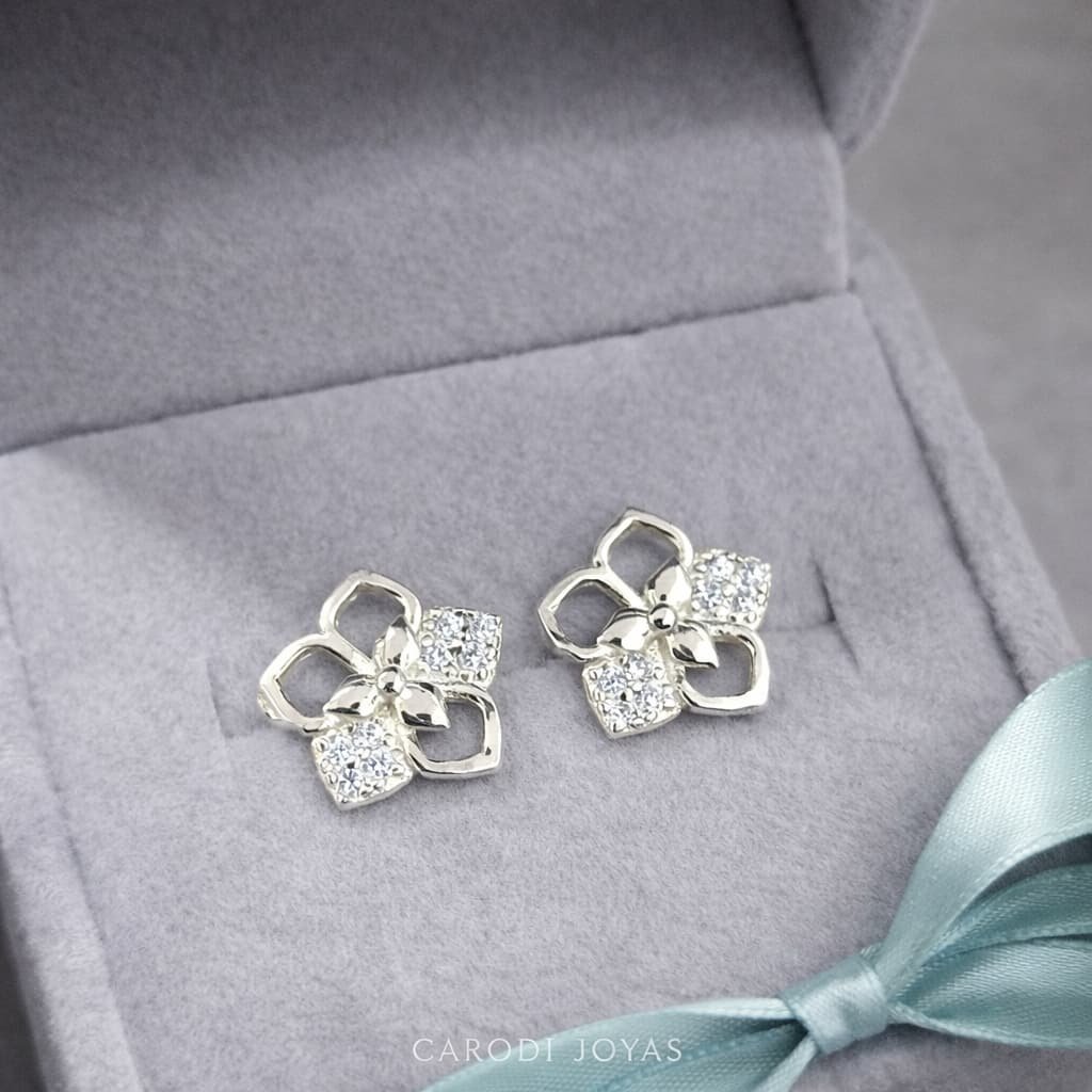 Aretes de Plata para mujer Flores brillantes, un «te quiero» que brilla para siempre. Hay sentimientos que no necesitan palabras, y estos aretes en forma de flor son el mensajero perfecto. Delicados, amorosos y llenos de luz, han sido creados para esa persona que ilumina tus días. Es el detalle lleno de ternura que le recordará, cada vez que se mire al espejo, lo especial que es para ti.